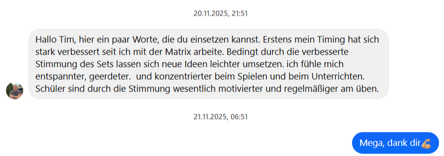 "Erstens mein Timing hat sich stark verbessert seit ich mit der Matrix arbeite. Bedingt durch die verbesserte Stimmung des Sets lassen sich neue Ideen leichter umsetzen. Ich fühle mich entspannter, geerdeter und konzentrierter beim Spielen und beim Unterrichten. Schüler sind durch die Stimmung wesentlich motivierter und regelmäßiger am üben."