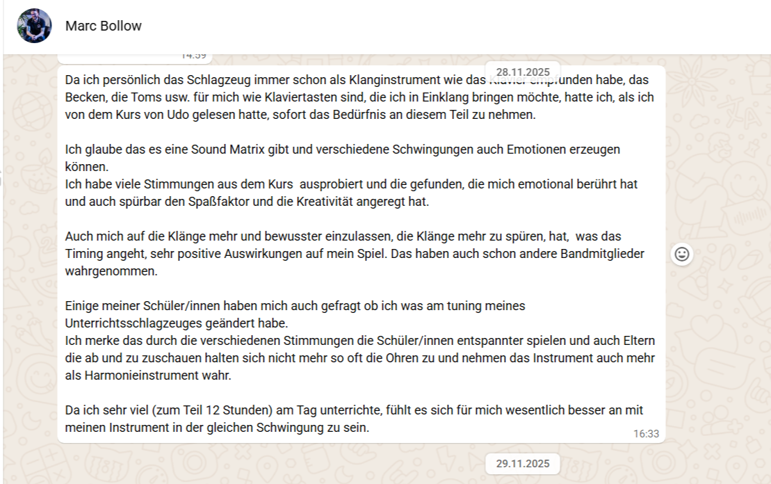 "...Ich habe viele Stimmungen aus dem Kurs ausprobiert und die gefunden, die mich emotional berührt hat und auch spürbar den Spaßfaktor und die Kreativität angeregt hat. Einige meiner Schüler/innen haben mich auch gefragt, ob ich was am Tuning meines Unterrichtsschlagzeuges geändert habe. Das haben auch schon andere Bandmitglieder wahrgenommen..."