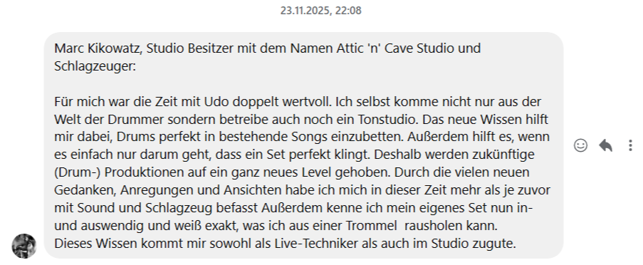 "...Für mich war die Zeit mit Udo doppelt wertvoll. Das neue Wissen hilft mir dabei Drums perfekt in bestehende Songs einzubetten. Durch die vielen neuen Gedanken, Anregungen und Ansichten habe ich mich in dieser Zeit mehr als je zuvor mit Sound und Schlagzeug befasst. Dieses Wissen kommt mir sowohl als Live-Techniker als auch im Studio zugute..."